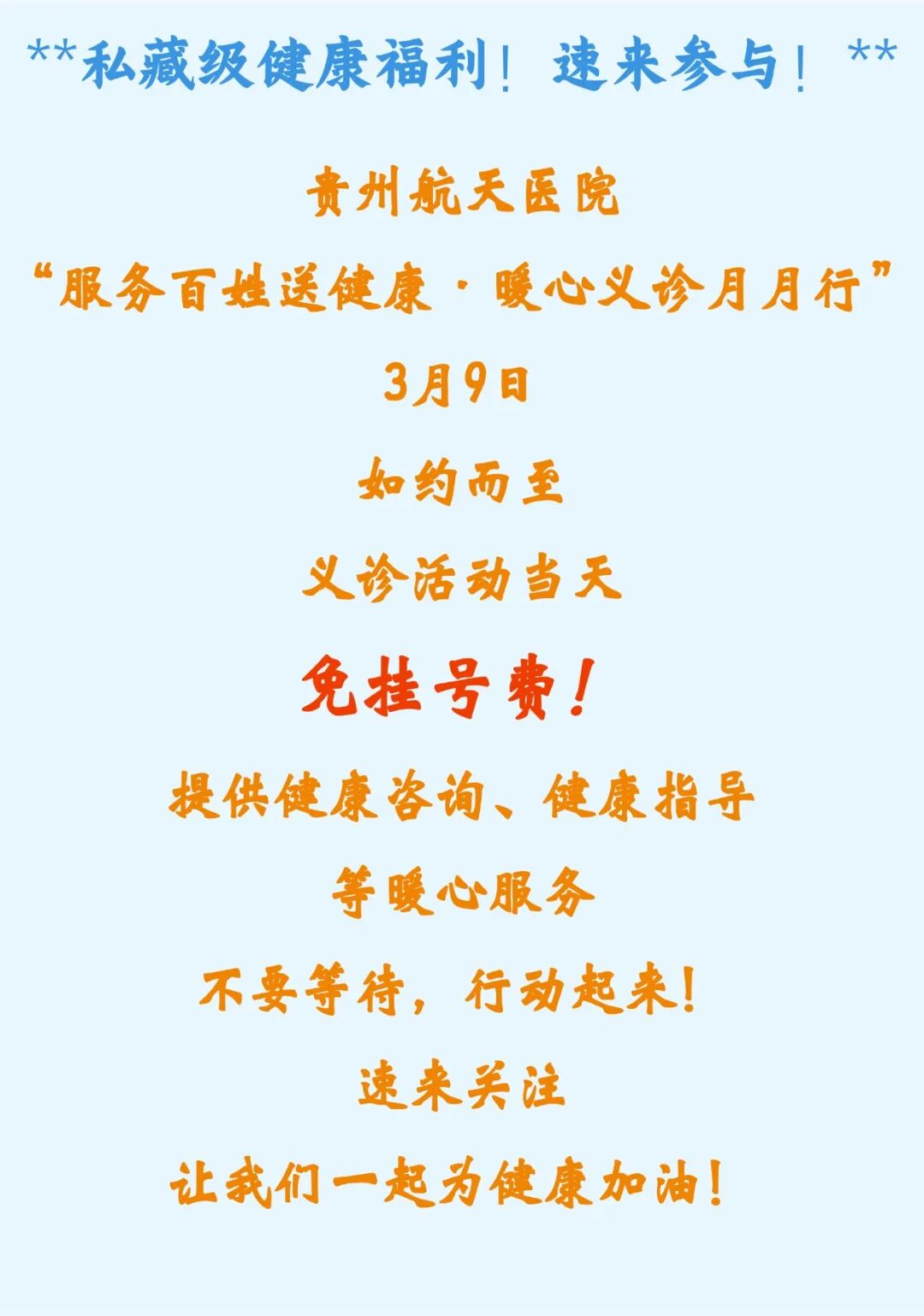 义诊时间 时 间:2026年3月9日(周一) 上 午:08:00——12:00 下 午:13:00——17:00 义诊地点 贵州航天医院门诊部 义诊团队 本次义诊汇聚了呼吸内科、骨科、神经内科、泌尿外科、血管甲乳外科、全科医学科、儿科、妇科、产科、消化内科、普外科、皮肤科、眼科、口腔科、临床营养科等27个科室专家 义诊内容 1.本次义诊免挂号费(挂号单只限当日使用,过期作废)。 2.免费进行相关疾病咨询、初筛、诊断和用药指导。 就诊必读 1.请携带身份证或医保卡至自助挂号缴费机或门诊收费处进行现场挂号,也可以关注贵州航天医院微信公众号预约挂号。 2.请按照挂号顺序有序就诊。 3.有既往病史的患者请带好半年内相关检查报告。 义诊科室及专家介绍 肝胆外科:门诊综合楼104诊室 赵 鹏 肝胆外科主任、学科带头人,副教授,博士研究生 临床擅长:对胰腺癌、肝癌、胆管癌、胆囊癌、肝内结石、肝外结石、胆囊结石、肝硬化脾肿大和脾功能亢进、肝囊肿等常见疾病的诊治具有丰富的临床经验;擅长胆囊切除术、胆道探查取石术、肝叶切除术、胆肠吻合手术,胰腺体尾部肿瘤切除,胰十二指肠开腹切除等经腹腔镜微创手术或开腹手术,内镜逆行性胰胆管造影术(ERCP)微创手术,尤其擅长对肝脏、胆道及腺系统等良恶性疾病的三、四级手术。 从事普外科临床、教学、科研工作近30年,年均开展肝胆胰腺及脾脏外科的开腹及腹腔镜等三、四级微创手术300余台,已完成ERCP手术近3000台,专研神经内分泌肿瘤、肝胆及胰腺癌症转化治疗。 神经内科:呼吸综合楼004诊室 石国霰 九三学社社员,神经内科主任,主任医师 临床擅长:从事神经疾病临床诊治工作30多年,对脑血管病、癫痫、神经系统感染性疾病、变性疾病、神经系统免疫性疾病、神经遗传性疾病的诊治具有丰富的临床经验。 北京神经内科学会全科医学委员会常务委员,北京神经内科学会委员,第二届中国研究型医院学会眩晕医学专业委员会常务委员,首届中华自愿者协会-中西医结合学会-神经病学组委员,贵州省医学会神经介入分会常委,遵义市医疗质控中心副主任委员,贵州省脑卒中防治专业委员会委员,贵州省医学会神经康复医学分会委员,贵州省医学会遵义市神经疾病分会副主任委员,贵州省健康科普专家,遵义市健康科普专家。 泌尿外科、男科门诊:门诊综合楼110诊室 石 英 泌尿外科党支部书记、主任,主任医师 临床擅长:从事泌尿外科专业近30年,熟练掌握泌尿系各类疾病的诊治,具有丰富的临床经验,擅长泌尿系结石、腹膜后肿瘤及泌尿系肿瘤的手术治疗,对泌尿系感染、泌尿系结核、尿源性脓毒血症的救治有独到的见解及抢救经验。在贵州省率先引入输尿管软镜技术,同时在男科领域,对男性阳痿、早泄及前列腺疾病有很深的研究。 中国医师协会泌尿外科分会感染协作组委员,奥林巴斯泌尿系软镜西南区专家组成员,西南地区第一批输尿管软镜专家组成员,贵州省医学会泌尿外科分会委员,贵州省性学会理事,贵州省性学会常务委员,贵州省泌尿外科专业医疗质量控制中心专家委员会委员。 结核门诊:肺传楼旁 杨昌恒 呼吸与危重症医学科主任医师 临床擅长:从事呼吸科工作20余年,对呼吸科疑难病及危重症救治具有丰富的临床经验。 1997年毕业于遵义医学院临床医疗系,曾在重庆医科大学呼吸科ICU进修学习,在中华肺部疾病杂志、工业卫生与职业病杂志、实用医学杂志等杂志发表论文10余篇。 肾脏风湿科:门诊综合楼109诊室 王卫华 肾脏风湿科主任医师 临床擅长:从事临床工作28年,擅长尿毒症患者血管通路的建设及维护(如标准和高位动静脉内瘘术、取栓+内瘘重建术、内瘘狭窄球囊扩张术、长期中心静脉置管术及肾穿刺活检术)等手术,对原发性和继发性肾病综合征、急、慢性肾小球肾炎、慢性肾脏病、泌尿系感染、结缔组织病、急性中毒、痛风、贫血、血小板减少症等疾病诊治及血液透析技术应用等具有丰富的临床经验。 1995年毕业于遵义医学院临床医学系,曾前往重庆医科大学进修学习肾脏疾病及血液净化,遵义市医学会肾脏病学分会常务委员,遵义市血液净化质量控制中心委员,先后发表肾病专业省部级医学刊物医学论文8篇,主持市级科研项目2项。 儿科发热门诊:发热门诊楼1楼 姚家会 儿科主任医师 临床擅长:擅长小儿呼吸系统疾病、消化系统疾病、感染性疾病、结核病、结缔组织疾病、神经系统疾病的诊治,尤其对小儿呼吸系统喘息性、过敏性疾病、重症肺炎、结核病等具有丰富的临床诊疗经验。 1997年毕业于遵义医学院(现遵义医科大学)临床医学系,2005年至2006年赴上海儿童医院进修学习,多次参加省内外学术交流活动及培训学习;发表论文近20篇,主持参与完成科研课题研究3项,开展新技术新项目,参与主编专著1部,获得实用新型专利多项。 儿科:门诊综合楼217诊室 游德敏 中共党员,儿科主任,副主任医师 临床擅长:从事儿科工作约20年,擅长儿科常见病及多发病的诊治,对儿科急危重症如呼吸循环衰竭、重度脱水、惊厥持续状态、哮喘持续状态、重症手足口病和儿童肺结核、结核感染、结核性脑膜炎的诊治有丰富的临床经验。 曾前往上海交通大学附属新华医院进修学习;是遵义市院前医疗急救专家,遵义市预防接种异常反应调查诊断专家组成员;发表论文数篇,主持完成新技术新项目1项,获得实用新型发