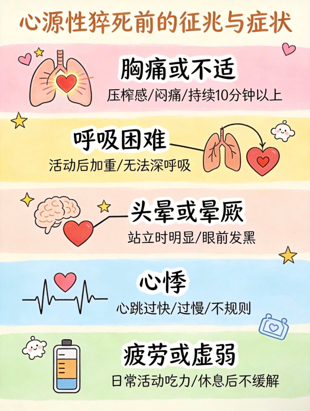 近日,一位知名教育博主突然因心源性猝死离世,让无数人感到震惊与惋惜。这声警钟也让我们反思:那些看似遥远的心源性猝死,真的毫无征兆吗?很多时候,悲剧的发生,就源于我们一次次忽略了身体发出的微弱“警报”,总以为“忍一忍就过去了”。今天,我们就来聊聊,如何识别这些信号,守住我们生命的底线。 猝死,并非“突然袭击” 很多人觉得猝死是“突然”的,但事实上,这不是无缘无故的,而是“隐匿问题”遇上“危险诱因”的结果。大多数心源性猝死在平时就存在潜在问题(如冠心病、心肌病、心律失常、结构性心脏病等),平静期可能并无明显症状,但在长期熬夜、过度劳累、剧烈运动、情绪巨大波动时,就可能被瞬间“引爆”,就像是心脏电路系统或供血管道突然发生的严重故障。 五大求救信号必须关注 临床数据显示,很多患者在出事前,身体都发出过警示。如果出现以下任何一种情况,尤其是反复出现或突然加重时,请务必警惕,及时就医检查: 高危人群、危险因素 猝死并非只找病人,不良生活习惯会大大增加风险。以下人群和习惯需要特别关注: 健康“内忧”:患有“三高”(高血压、高血糖、高血脂)、肥胖、冠心病的人,是风险较高的人群。 生活“外患”:吸烟、酗酒、长期熬夜、持续高压、缺乏运动、暴饮暴食,这些都在悄悄损伤您的心血管系统,是重要的“导火索”。 简单来说:不健康的生活习惯,会让心脏“供电线路”和“输油管道”老化、生锈得更快。 6个“护心法则”科学预防 预防永远大于治疗。守护心脏健康,可以从日常生活点滴做起: 吃好一点:低盐、低脂、低糖,多吃蔬菜水果和粗粮,给血管“减负”。 动对一点:坚持规律、适度的运动(如快走、慢跑、游泳),但避免在极度疲惫时剧烈运动。感觉累了,散步就是最好的运动。 睡足一点:保证充足、规律的睡眠,这是给心脏最好的“充电”。 看开一点:学会管理情绪,找到释放压力的健康方式(如聊天、兴趣爱好)。 戒掉坏习惯:坚决戒烟,严格限酒。 定期查一查:尤其是有“三高”、肥胖、或有心脑血管疾病家族史的人,定期体检(特别是心电图、心脏彩超等)非常重要,能帮助早期发现问题。 愿我们都能在拼搏的路上,拥有承载梦想的、健康有力的心跳。 贵州航天医院 心血管内科专家简介 刘 俊 国家心脏病中心&中国医学科学院阜外医院心血管内科 主任医师 心律失常中心执行主任兼心律失常一病区主任 清华大学医学部&北京协和 医学院心内科学医学博士 德国心脏病中心(柏林) 访问学者 丹麦奥胡斯大学医院 短期访问学者 贵州航天医院心血管内科学科带头人 专业擅长:复杂、复发性心律失常(室上速、房颤、房速、室早、室速)的诊断和介入治疗(包括 三维标测系统Carto3/Ensite/心内超声导管指导的射频消融与冷冻消融、经皮左心耳介入封堵术)等。 学术任职:中国医疗保健国际交流会心律与心电分会第一届、第二届委员、第三届常务委员兼任秘书长,中华医学会心电生理与起搏分会第一届心电生理和起搏创新工作委员会委员兼秘书,中华医学会心电生理与起搏分会第八届委员会心电专业学组成员,中国生物医学工程学会心律分会第十届、十一届青年委员,家卫健委心血管疾病介入诊疗技术心律失常介入培训导师(导管消融+器械植入),《中国心血管病研究》杂志青年编委会委员,《中国心脏起搏与心电生理杂志》特约审稿人。 参与撰写著作9部、横向课题5项、纵向课题6 项,以第一作者、通讯作者发表文章64篇,其中SCI期刊文章15篇,署名文章共110 篇。 沈万贵 心内科党支部书记、主任,副主任医师 临床擅长:从事临床工作约33年,对冠心病,高血压病,各种心肌病等疾病的诊治以及内科疑难杂症疾病的诊疗具有丰富诊疗经验,累计实施冠心病、外周血管等疾病的介入手术诊疗过万例。擅长于冠脉复杂病变的介入手术治疗、肾动脉狭窄介入手术、下肢深静脉血栓的介入手术治疗。 贵州省医学会心血管病分会常务委员、贵州省心脏病康复医学会常务委员,遵义市医学会心血管病分会副主任委员,西南高血压病管理委员会常务理事,贵州省冠心病组委员;发表学术论文20余篇。 张羽坤 中共党员,心血管内科副主任,主任医师,硕士研究生 临床擅长:具备心血管疾病心律失常介入(导管消融及植入器械)国家级手术资质,参与各类心脏介入手术6000余例。以第一作者在国内核心期刊发表医学论文10余篇,主持市级科研项目1项。 曾先后前往贵州省人民医院、国家心脏中心北京阜外心血管病医院学习深造(2017年11月至2018年11月参加第二期黔医人才计划并获得优秀学员称号),2022年获得贵州省“第二届最美劳动者”称号。 中国医疗保健国际交流促进会心律与心电分会第三届委员,中国老年医学学会心血管病分会第二届委员会基层委员,贵州省心电生理与起搏分会委员,贵州省中西医结合学会心血管专业委员会委员,遵义医学会心血管病学分会常委,遵义市医学会(第六届)理事会理事,遵义市健康科普专家;是遵义医科大学科技学院及遵义医药高等专科学校兼职教师。 李树刚 中共党员,心血管内科主任医师 临床擅长:具备冠心病介入手术治疗资质,对心内科各种常见病、多发病及急性冠脉综合征疾病具有丰富的临床诊治经验,完成各项冠心病介入治疗6000余台。 毕业于遵义医学院临床医学专业,以第一作者在
