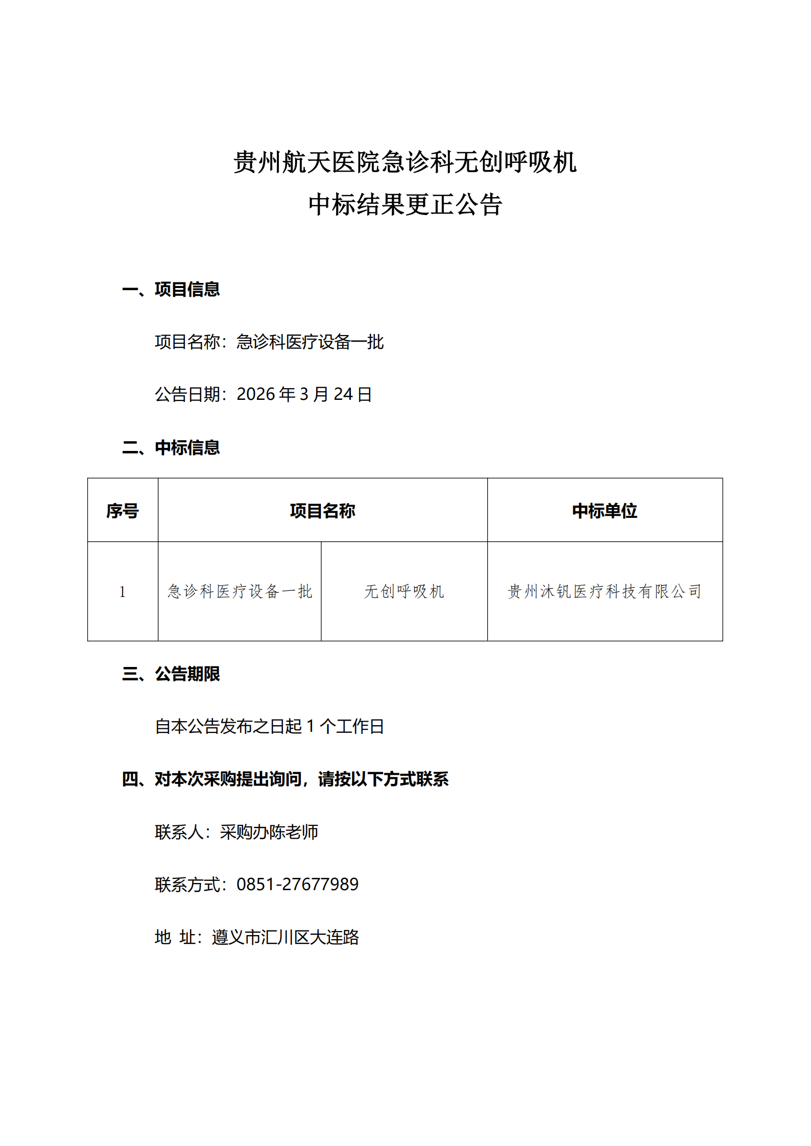 贵州航天医院急诊科无创呼吸机中标结果更正公告